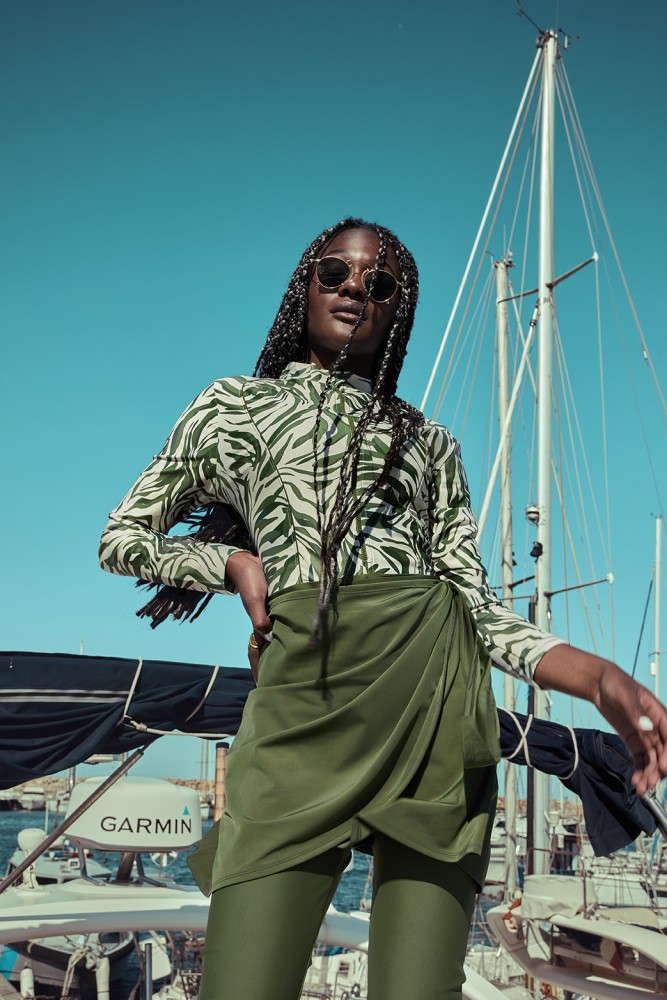 Our Gold Horizon look, crafted with the utmost care, consists of three pieces:(1) a sublimated swimsuit in two refined shades of nude and military green, perfectly paired with(2) an elegant green skirt, and(3) a matching swimwear scarf.
