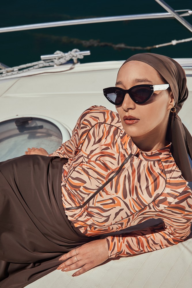 Our PEARL look, crafted with the utmost care, consists of three exquisite pieces: (1) a sublimated swimsuit in multiple refined shades, perfectly paired with (2) an elegant brown skirt and (3) a matching swimwear scarf.