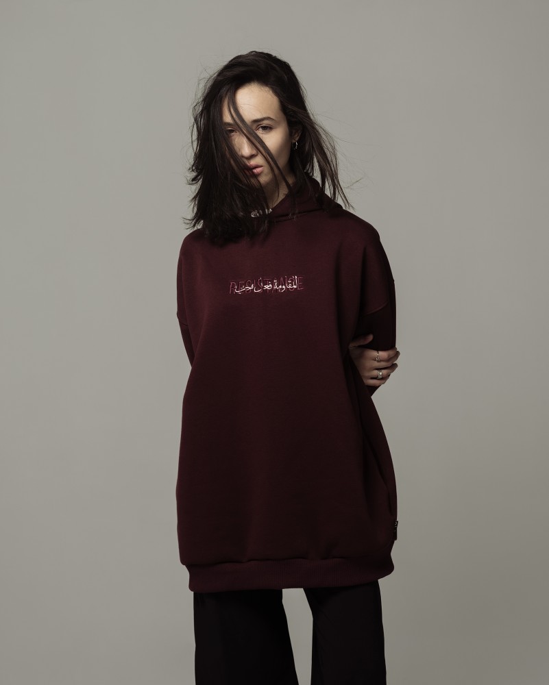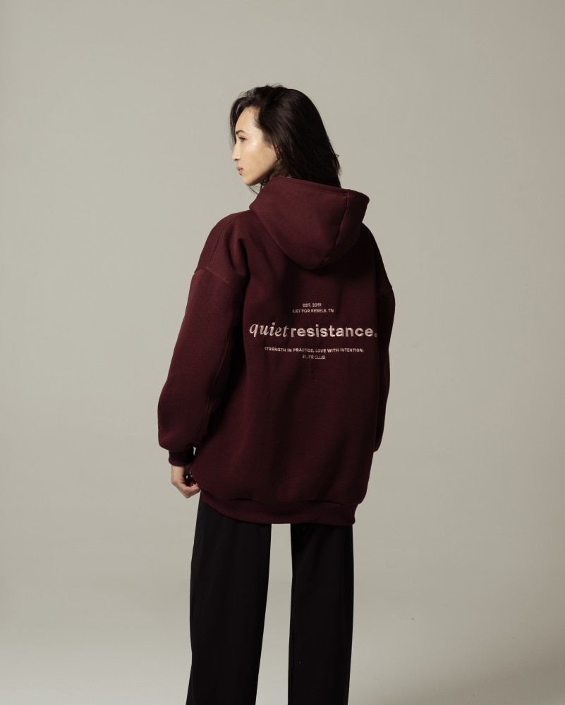An oversized hoodie in deep burgundy, designed as a powerful yet quiet expression of love and resistance.