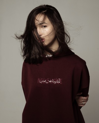 The relaxed silhouette is defined by two-piece sleeves and refined stitching details that give structure to the volume. Embroidered messages appear on the front and back in a mix of pastel pink and dark burgundy threads, blending Arabic lettering with an English word on the front, and expressing quiet resistance and inner strength on the back.