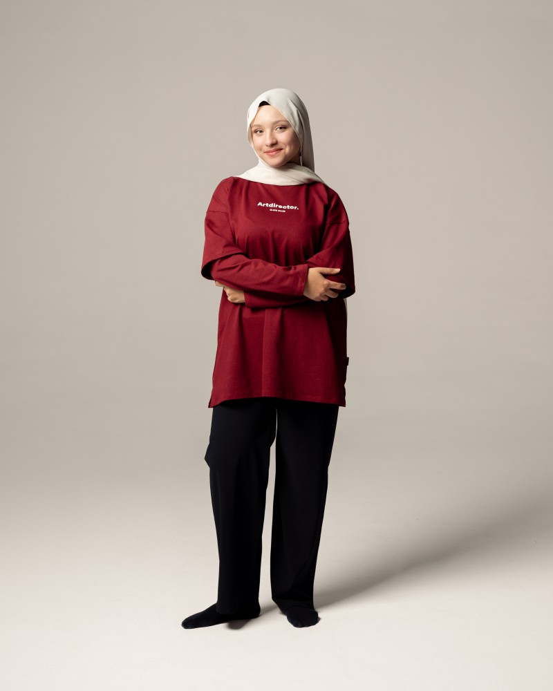A heavyweight burgundy top crafted from 100% cotton, designed to merge comfort with a bold, contemporary attitude. The piece plays with illusion, creating the visual effect of wearing two layered shirts while remaining clean and intentional.