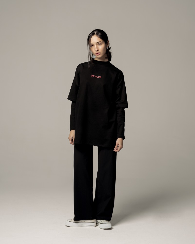 A heavyweight black cotton top designed for bold expression and effortless comfort. Crafted from 100% cotton, its oversized fit offers coverage and ease, with side slits that let the garment move naturally. The piece plays with a layered illusion, featuring contrasting sleeves , one half sleeve and one long sleeve , paired with a clean, minimal collar for a modern, trendy silhouette.