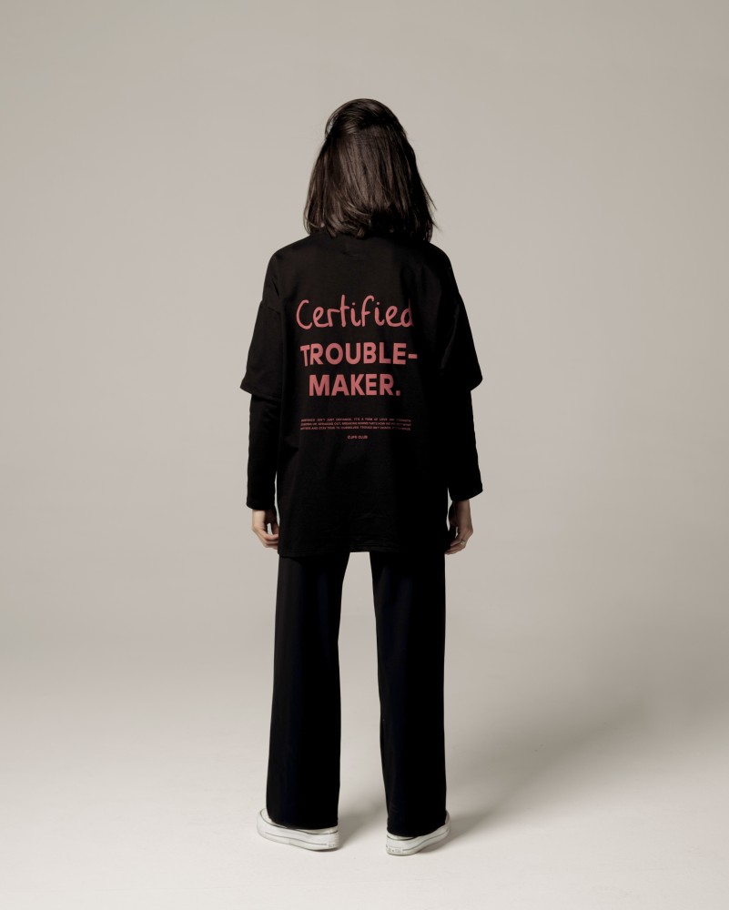 BACK: Certified trouble maker / Resistance isn’t just defiance. it’s a form of love and strength. Standing up, speaking out, breaking norms that’s how we protect what matters and stay true to ourselves. Trouble isn’t chaos, it’s courage. / @jfr club