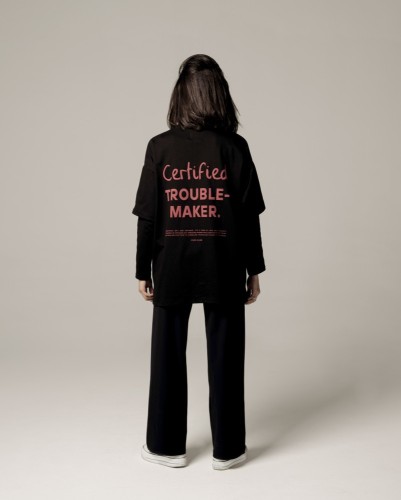 Light burgundy screen prints on the front and back carry a message about troublemakers, connecting rebellion with love and resistance. This piece balances statement and wearability, combining thoughtful proportions, strong graphics, and intentional design.